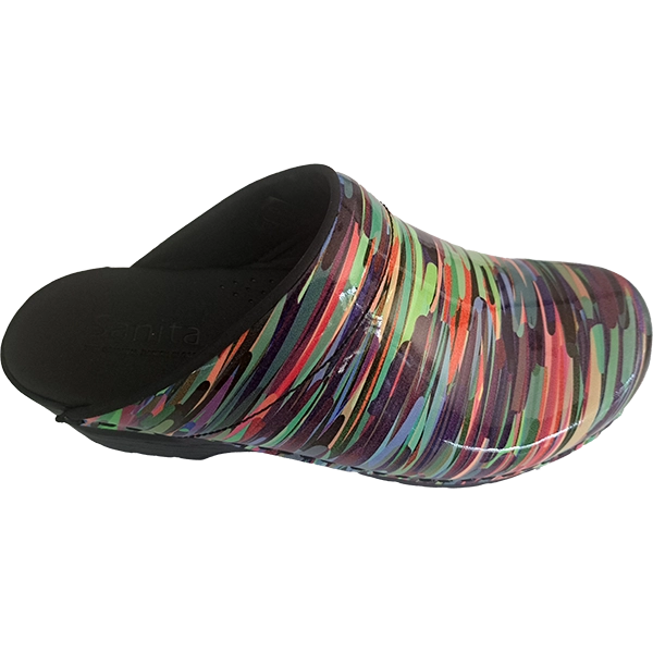 Open Clog in a new version of the classic San Flex clog. Made of high quality water resistant patent leather with print in bright colors. Slip resistant and shock absorbing PU outer sole with an anatomic footbed, ensures that the clog is comfortable during a long working day.